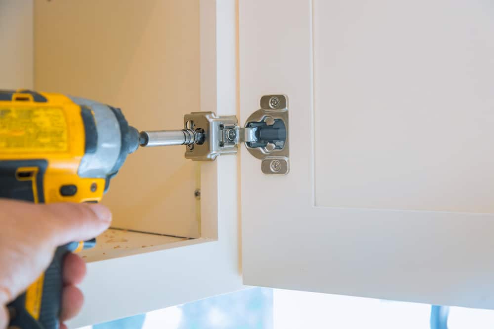 Vissez la charnière sur le cadre en premier (embase), en utilisant un niveau à bulle pour assurer un bon alignement si le meuble n’a pas d’avant trou déjà usiné.